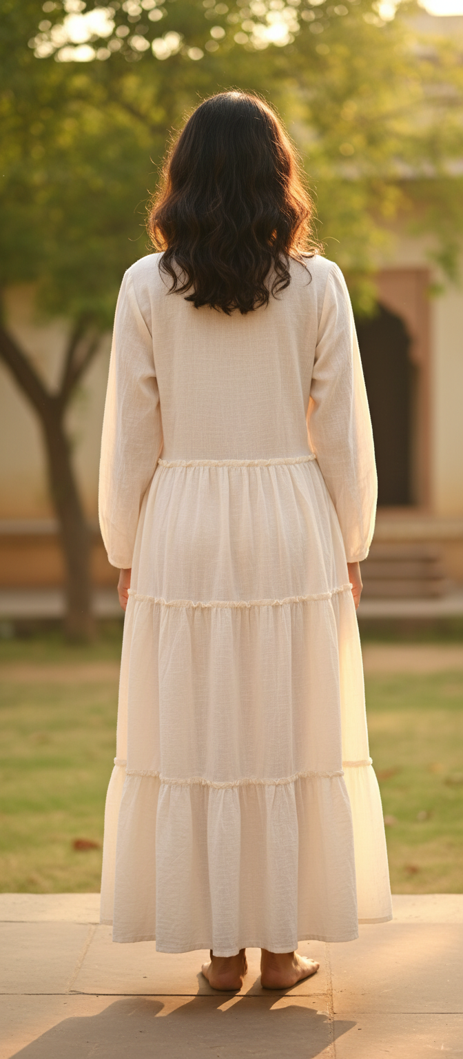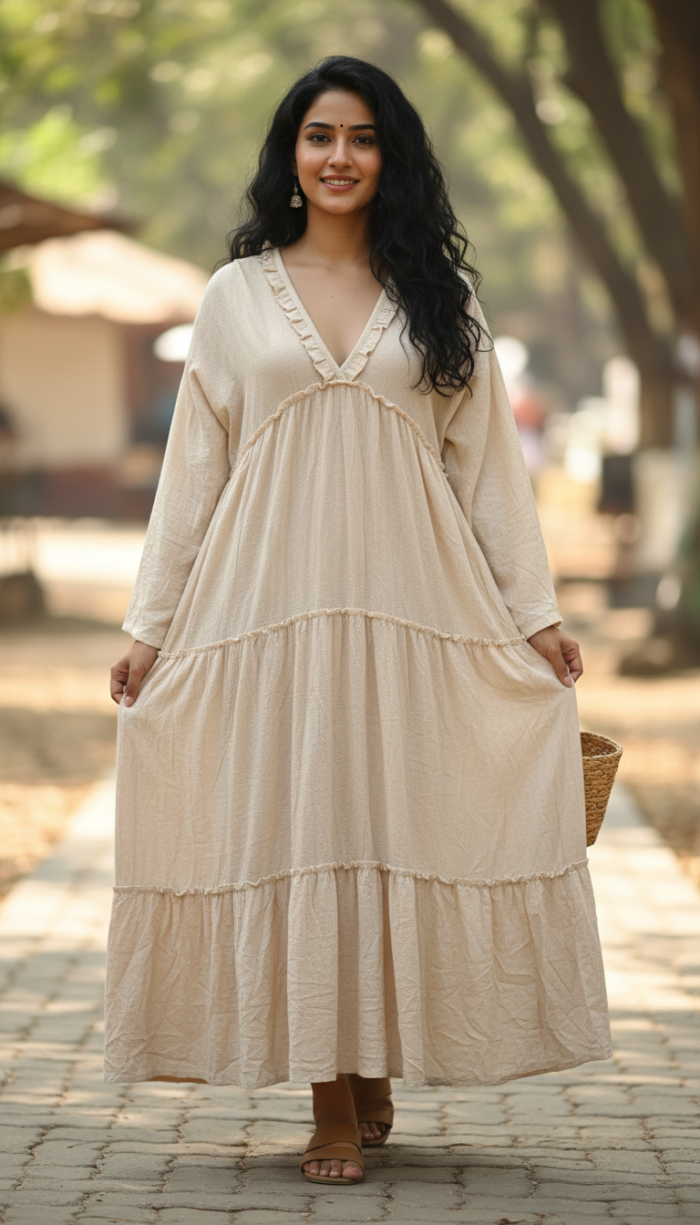 A V-shaped neckline finished with tiny frilly detailing adds a gentle feminine touch without overpowering the simplicity of the design. Long, flowy, and easy to style, the Aabhya Dress is perfect for brunch dates, travel, relaxed gatherings, or resort wear.