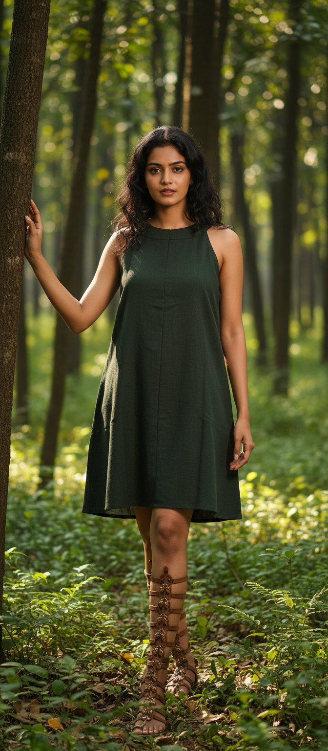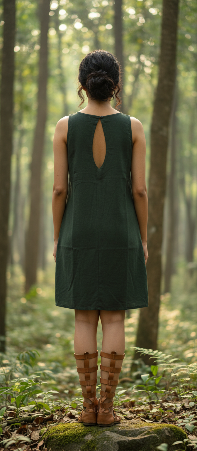Crafted from organic cotton, the fabric is soft, breathable, and comfortable for all-day wear. The A-line silhouette falls gracefully to knee length, offering an easy, flattering fit. Its sleeveless incut design keeps the look light and contemporary.