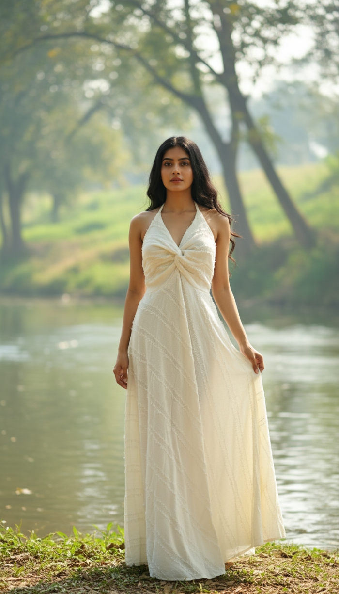 Made using organic cotton threads hand-pulled by our skilled artisans, the fabric feels soft on the skin while offering a naturally textured, luxurious finish. The twisted knot detail at the front neckline adds a unique statement, while the smocked back ensures a comfortable and flattering fit for all body types.