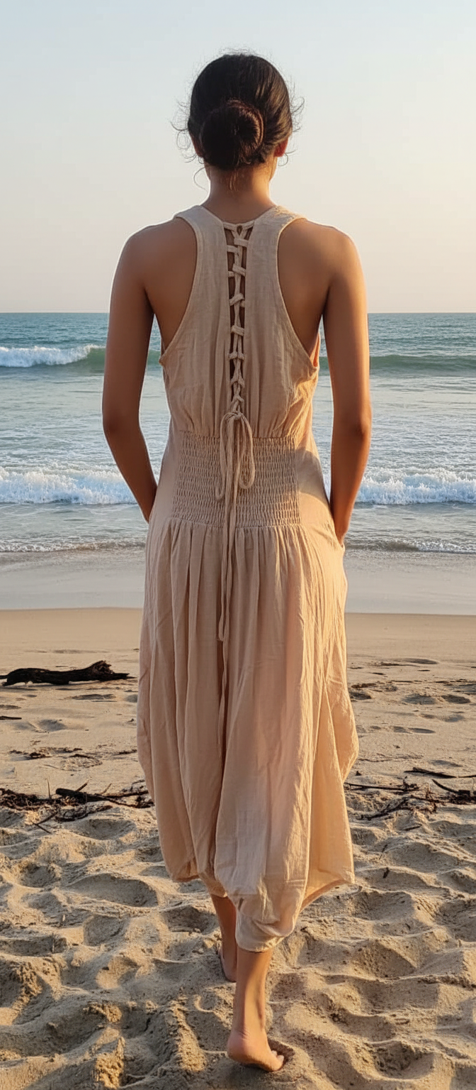Crafted from organic cotton, the fabric is breathable and soft, making it ideal for all-day wear. The round neckline with a racer-back design gives it a modern touch, while the smocked waist at the back offers comfort and flexibility.
